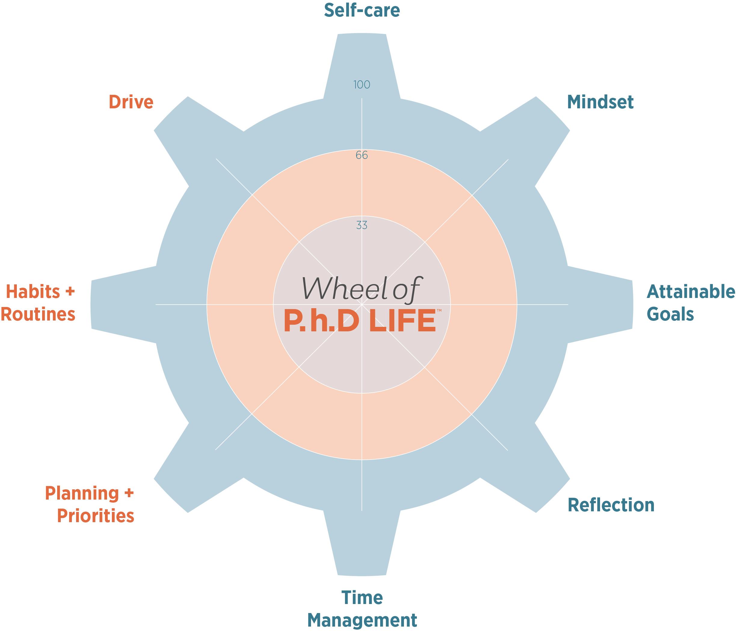 The Wheel of PhD Life is an assessment tool I created, inspired by the traditional Wheel of Life used in coaching. I have aligned it with my S.M.A.R.T.P.h.D™ coaching framework to evaluate the 8 key areas to influence PhD success.